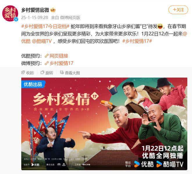 《乡村爱情 17》官博发布定档海报写道:“蛇年即将到来看我象牙山乡亲们蓄‘巳’待发,在春节期间为全世界的乡亲们呈现更多精彩,为大家带来更多欢乐!1 月 22 日 12 点一起来优酷、酷喵 TV ,感受乡亲们回屯的欢欣氛围吧!”
